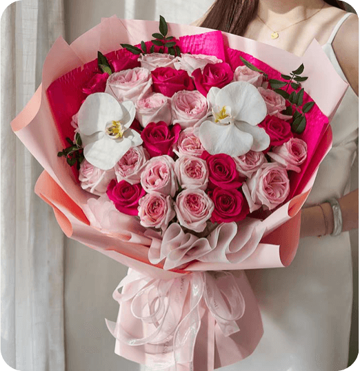 心之所爱/心形双色玫瑰款·弗洛伊德玫瑰13枝,粉色玫瑰20枝,白色蝴蝶兰1朵