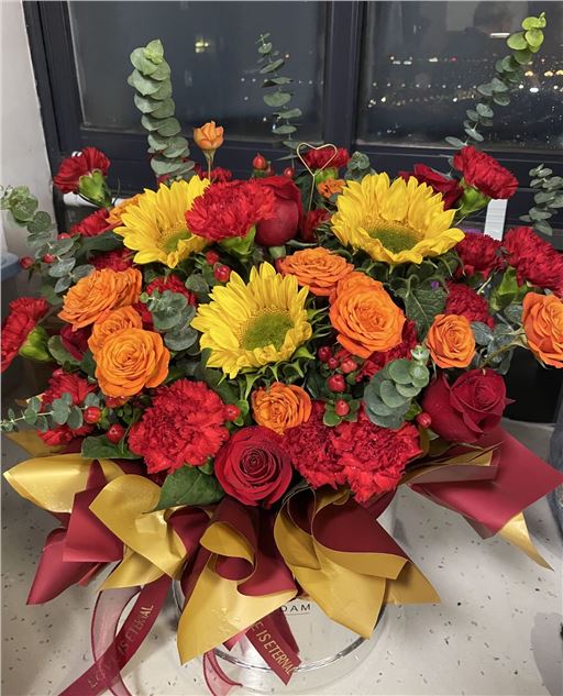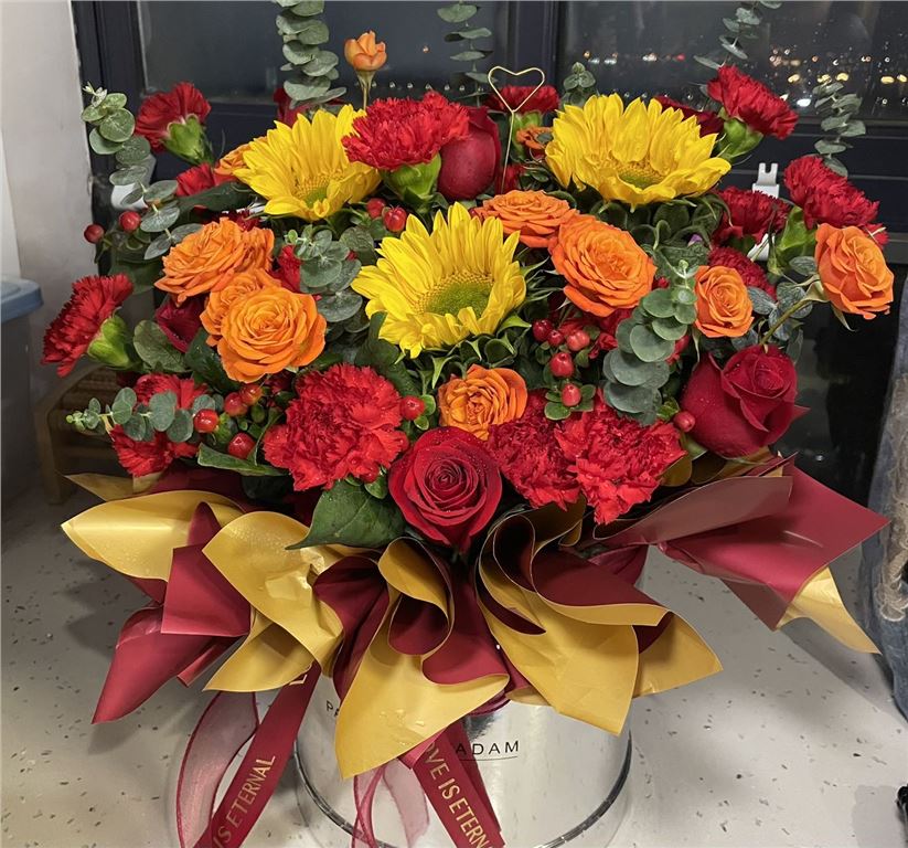 向日葵3枝、橙色康乃馨19枝、香槟玫瑰11枝、橙色腊梅2枝