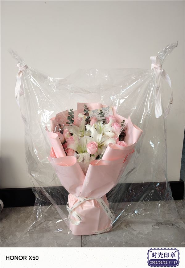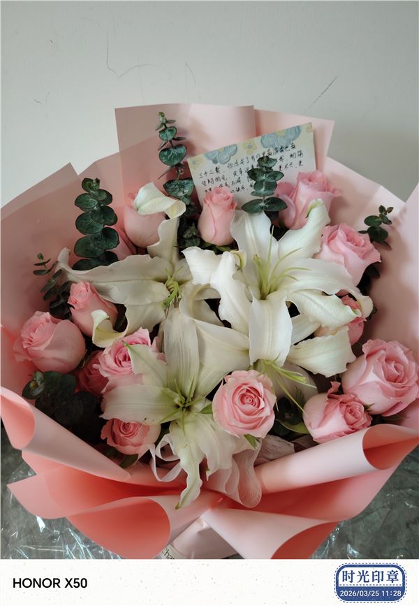 送花非常及时,早上不到九点就收到;花束完全与网上图片一样漂亮、鲜活;赠送的贺卡精美,收花人很开心很满意!完美传递了订花人的心意,谢谢!