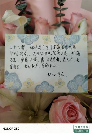字写的太丑啦~老婆说看到意犹未尽,实在不行机打呗, 这个花也不是很新鲜,有磕碰和卷边黄边的痕迹