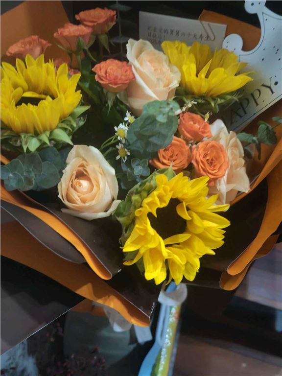 非常适合送男士的花了,整体色系大方稳重又不失温暖活力,很好。鲜花新鲜,快递守时,满意。