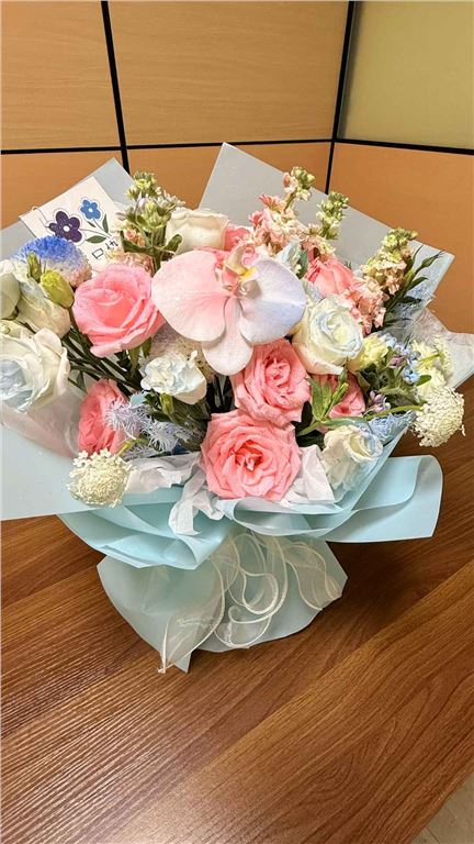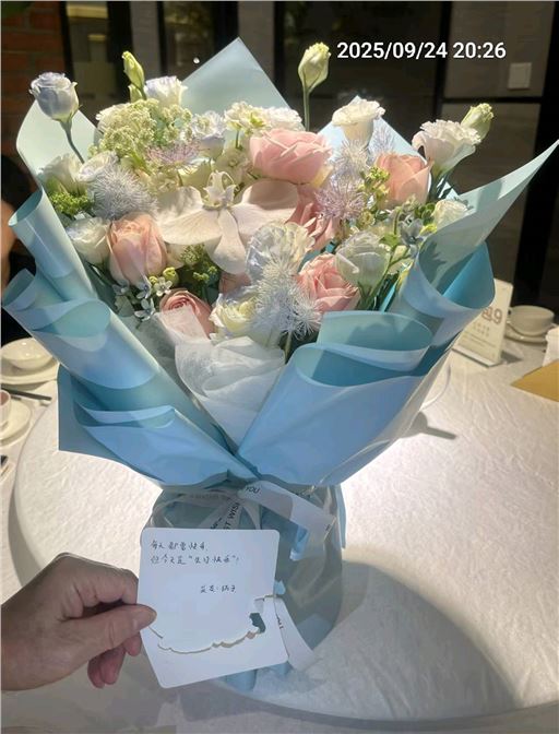 花质量挺好!配送也及时。如果不遗漏贺卡就完美啦。