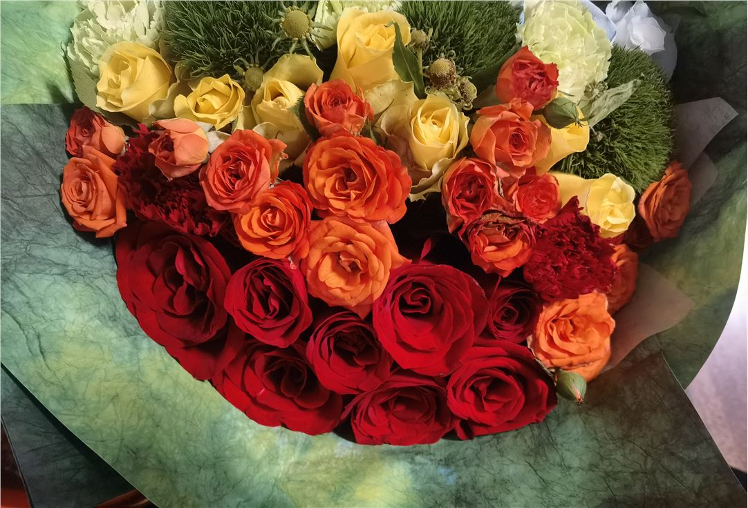 红玫瑰,红色康乃馨,橙色芭比多头玫瑰,黄玫瑰,油画小菊等