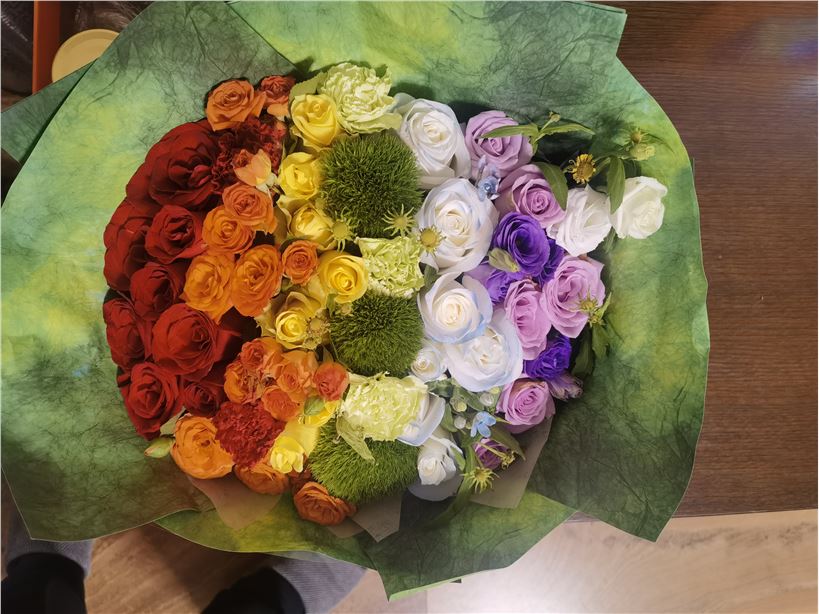 送货的速度非常快,9:00过一点就送到了。花非常新鲜漂亮,老婆很喜欢,就是外包油纸油味略重,建议用之前先敞一下。