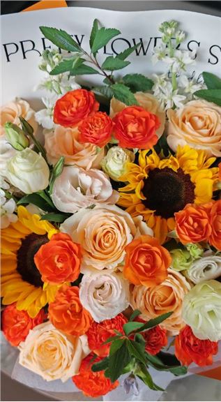 香槟玫瑰11枝、向日葵2枝、香槟色洋桔梗3枝、橙色多头玫瑰2枝、尤加利叶5枝