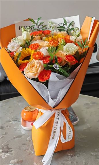 向日葵3枝、橙色康乃馨19枝、香槟玫瑰11枝、橙色腊梅2枝