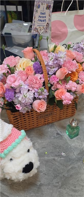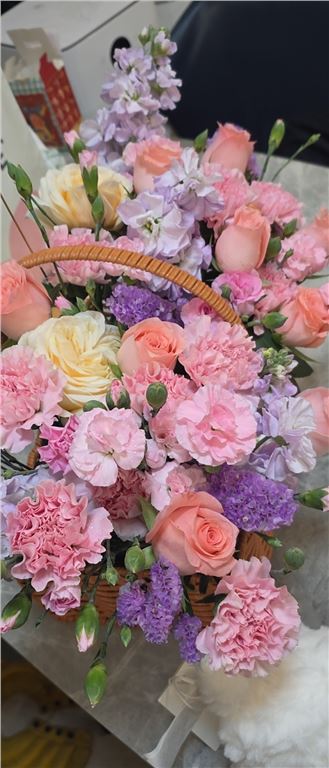 红色康乃馨19枝、粉色百合3枝、粉色多头康乃馨8枝