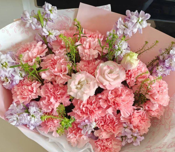 红色康乃馨19枝、粉色百合3枝、粉色多头康乃馨8枝