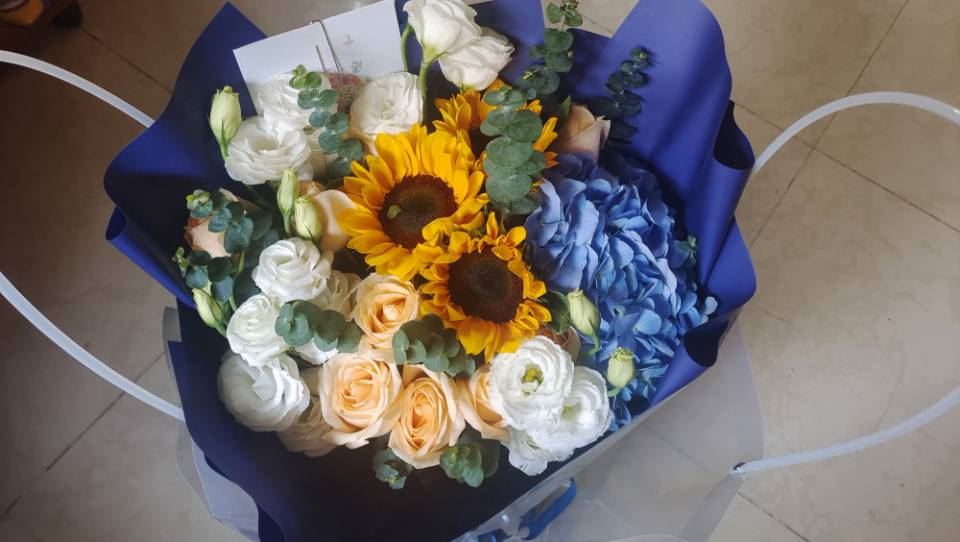 向日葵3枝、香槟玫瑰6枝、辉煌玫瑰5枝