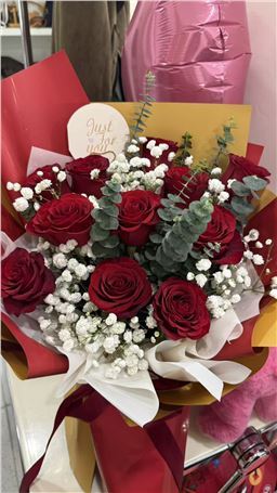 卡罗拉玫瑰9枝、粉色满天星1枝、尤加利5枝