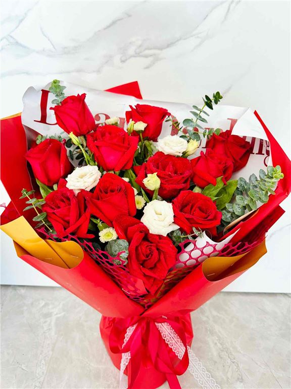 卡罗拉玫瑰9枝、粉色满天星1枝、尤加利5枝
