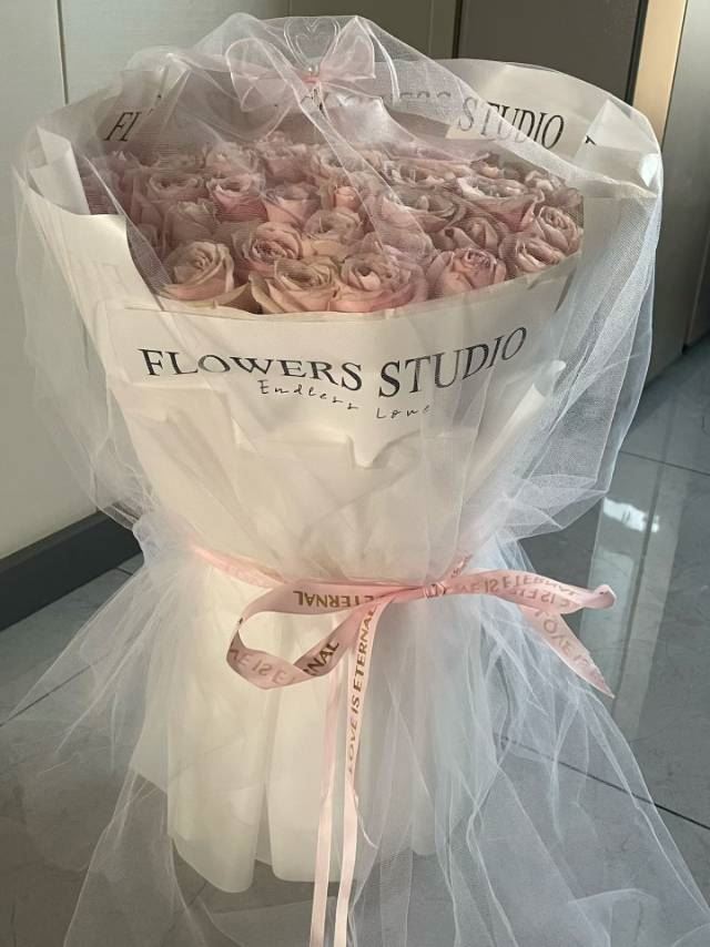 卡罗拉玫瑰9枝、粉色满天星1枝、尤加利5枝