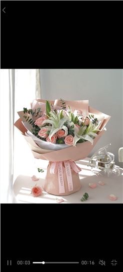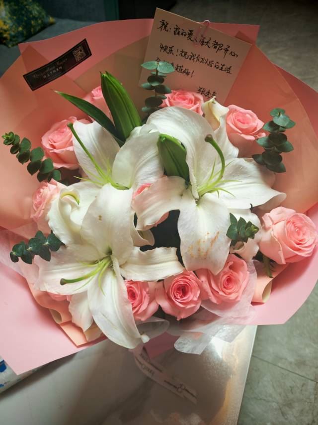 粉色百合2枝,粉玫瑰15枝,粉色康乃馨8枝,紫色紫罗兰6枝