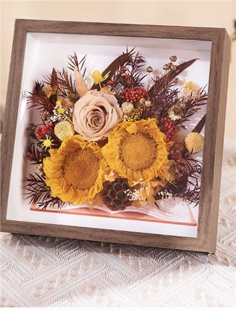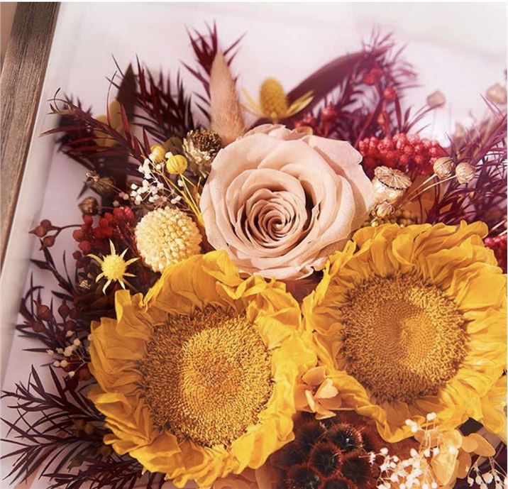 香槟玫瑰11枝、向日葵2枝、香槟色洋桔梗3枝、橙色多头玫瑰2枝、尤加利叶5枝