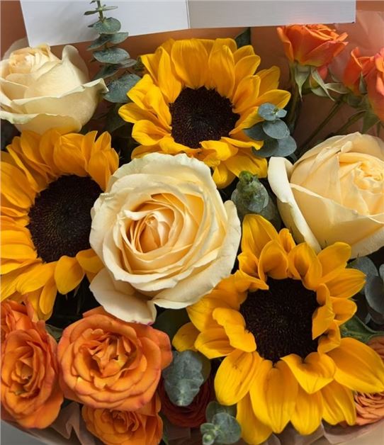 香槟玫瑰11枝、向日葵2枝、香槟色洋桔梗3枝、橙色多头玫瑰2枝、尤加利叶5枝