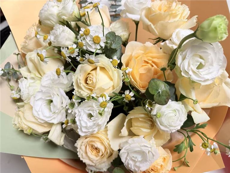 香槟玫瑰11枝、向日葵2枝、香槟色洋桔梗3枝、橙色多头玫瑰2枝、尤加利叶5枝