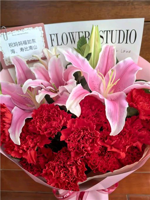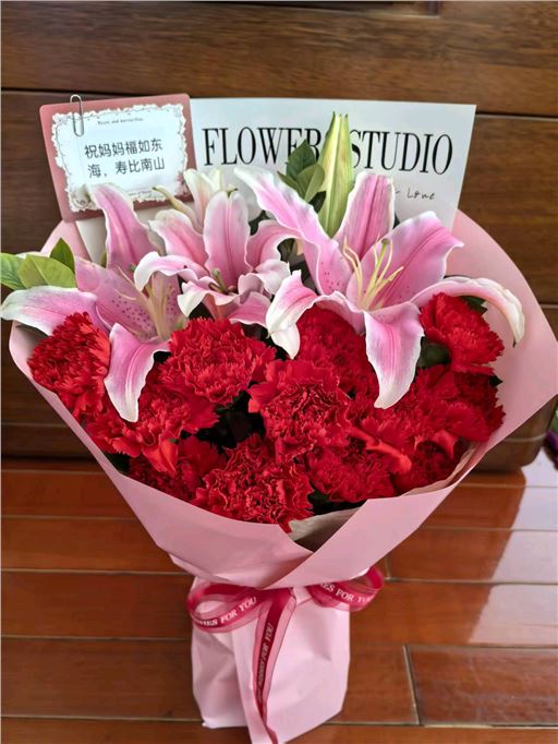 红色康乃馨19枝、粉色百合3枝、粉色多头康乃馨8枝