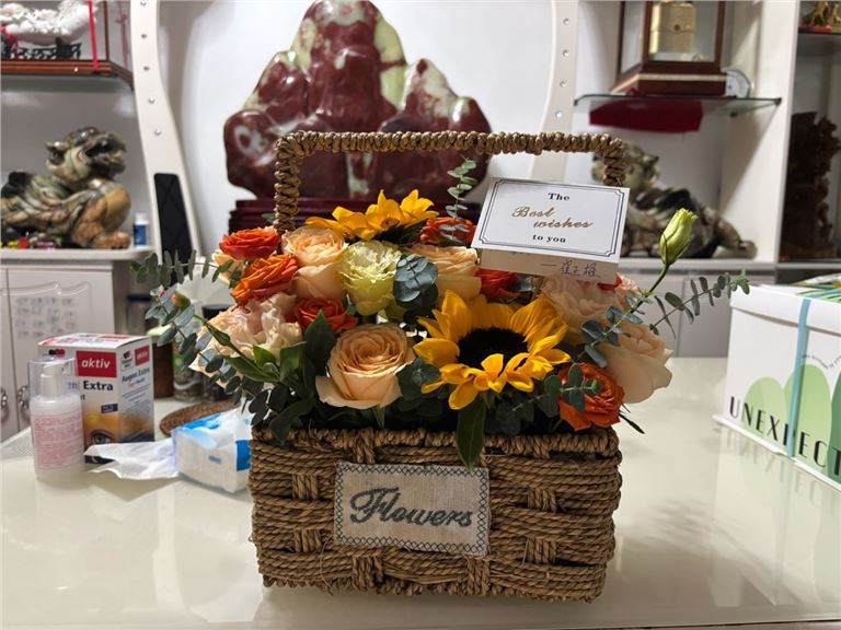 香槟玫瑰11枝、向日葵2枝、香槟色洋桔梗3枝、橙色多头玫瑰2枝、尤加利叶5枝