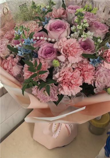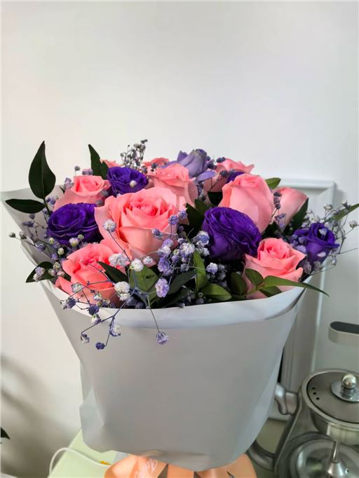 粉玫瑰13枝(或洛神玫瑰)、康乃馨8枝、紫罗兰10枝、洋牡丹3枝、百合1枝、洋桔梗4枝、粉掌2枝、粉绣球1枝