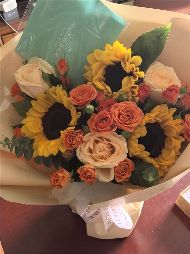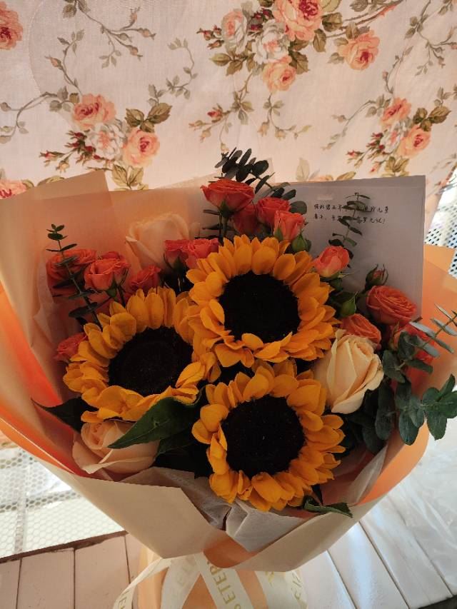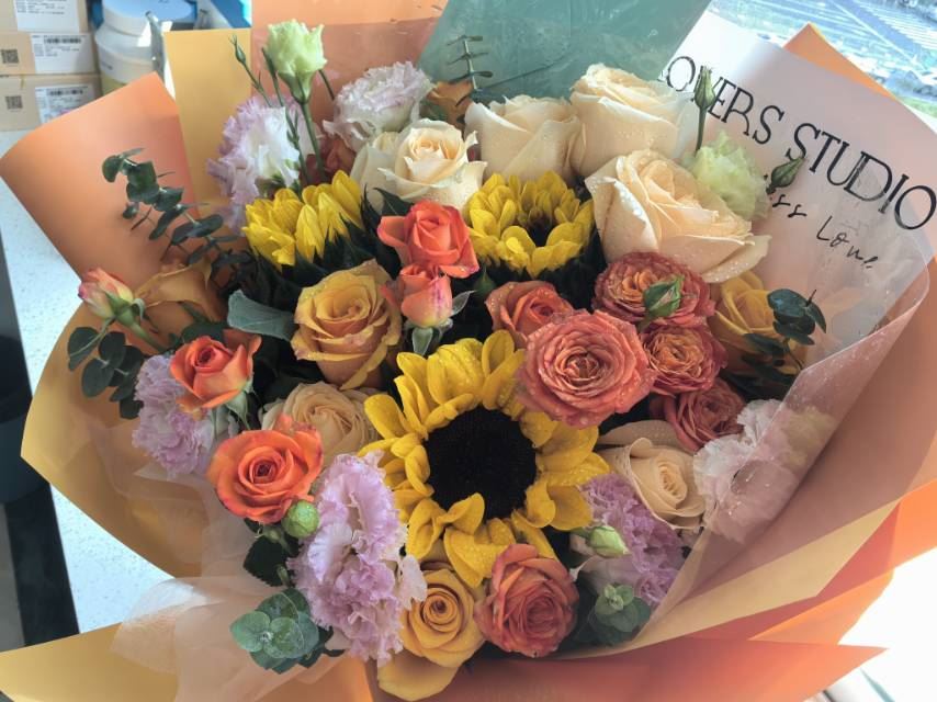 辉煌玫瑰10枝、橙色多头玫瑰5枝、向日葵3枝、红色烟花菊2枝、香槟色多头洋桔梗10枝