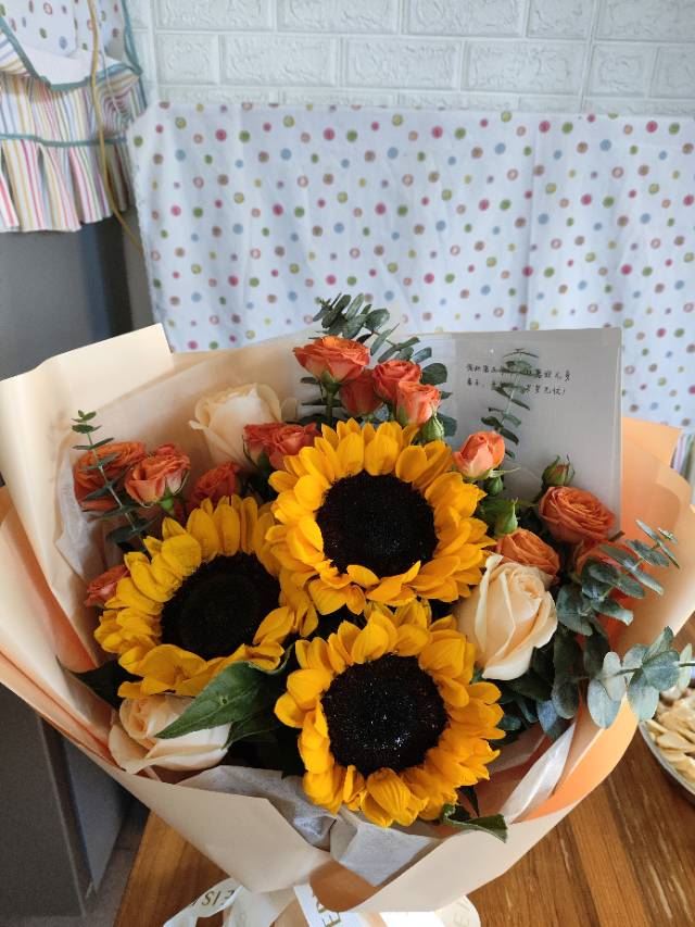 向日葵3枝、橙色康乃馨19枝、香槟玫瑰11枝、橙色腊梅2枝