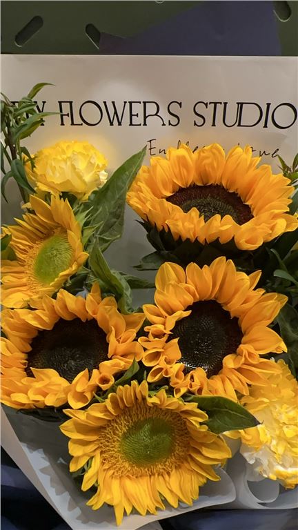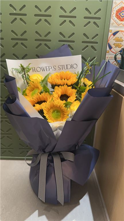 向日葵4朵、黄金球6枝、香槟10枝、白色洋桔梗3枝、绿色康乃馨5枝