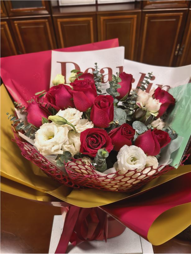 红玫瑰15枝、红橙色针垫2枝、郁金香4枝、水仙百合3枝、多头玫瑰4枝、扶郎花6枝、橙色芭比3枝