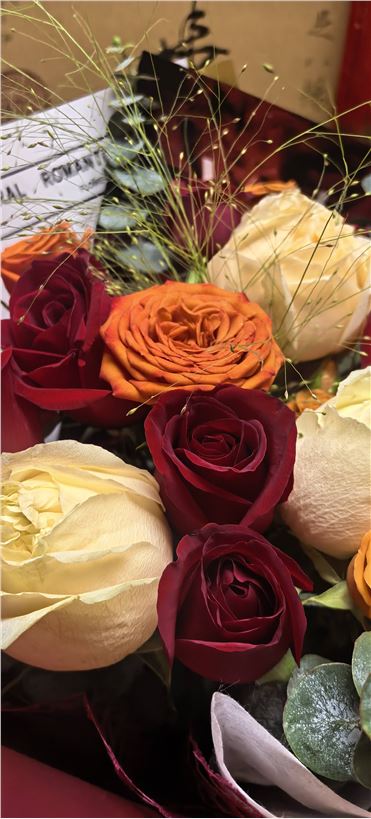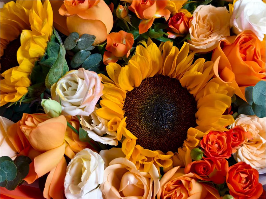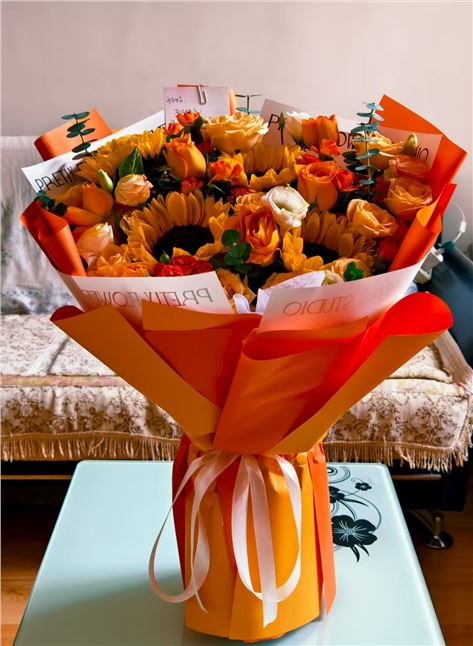 香槟玫瑰11枝、向日葵2枝、香槟色洋桔梗3枝、橙色多头玫瑰2枝、尤加利叶5枝