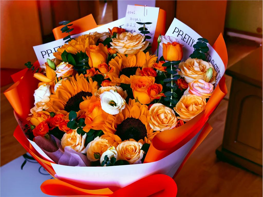 向日葵3枝、橙色康乃馨19枝、香槟玫瑰11枝、橙色腊梅2枝