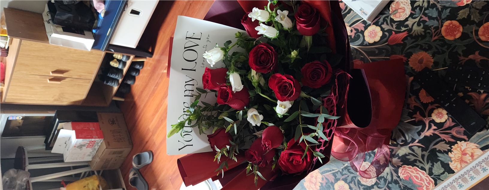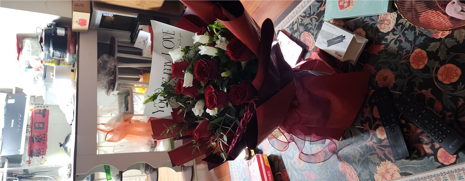 卡罗拉33枝、红色朱蕉叶3枝、千代兰7枝、大红色多头玫1.5扎