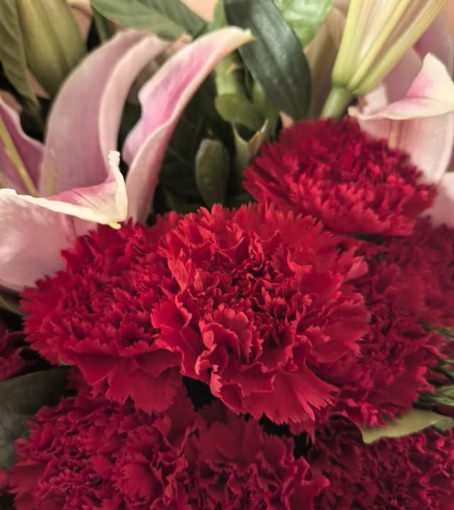 红色康乃馨19枝、粉色百合3枝、粉色多头康乃馨8枝