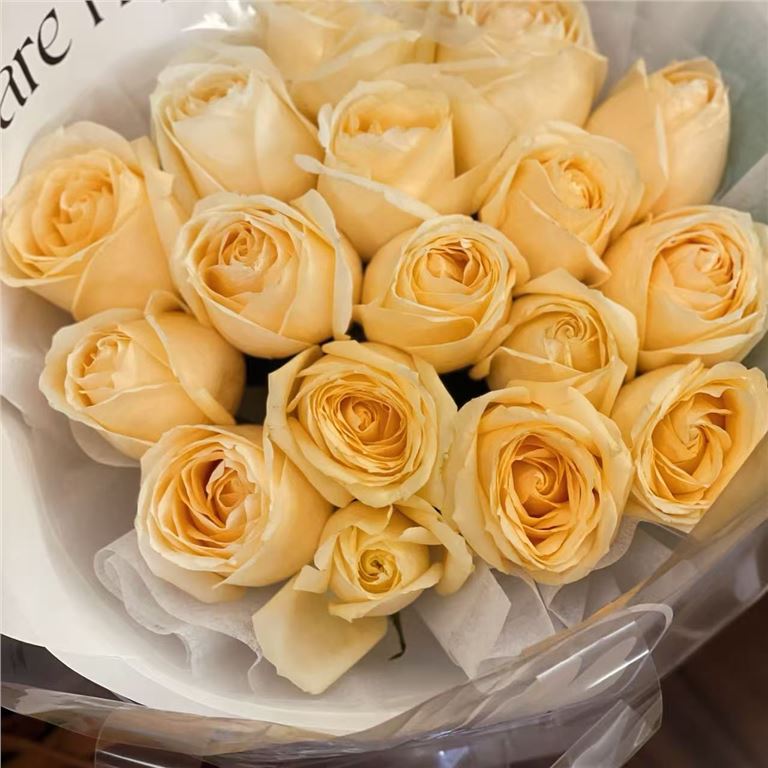 香槟玫瑰11枝、向日葵2枝、香槟色洋桔梗3枝、橙色多头玫瑰2枝、尤加利叶5枝