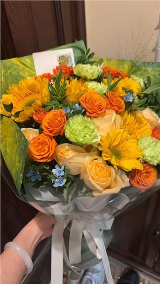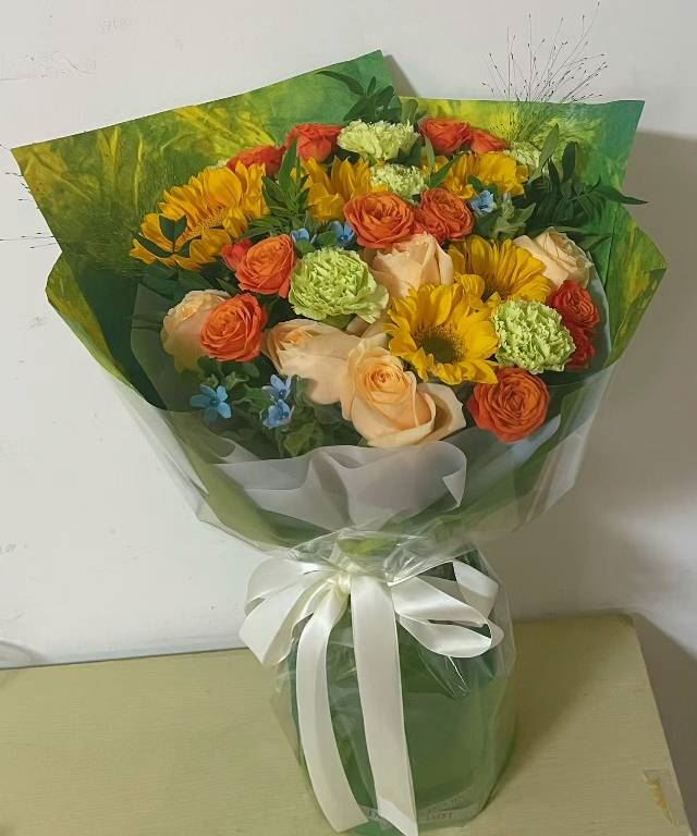 向日葵3枝、橙色康乃馨19枝、香槟玫瑰11枝、橙色腊梅2枝