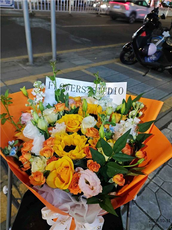 向日葵3枝、橙色康乃馨19枝、香槟玫瑰11枝、橙色腊梅2枝