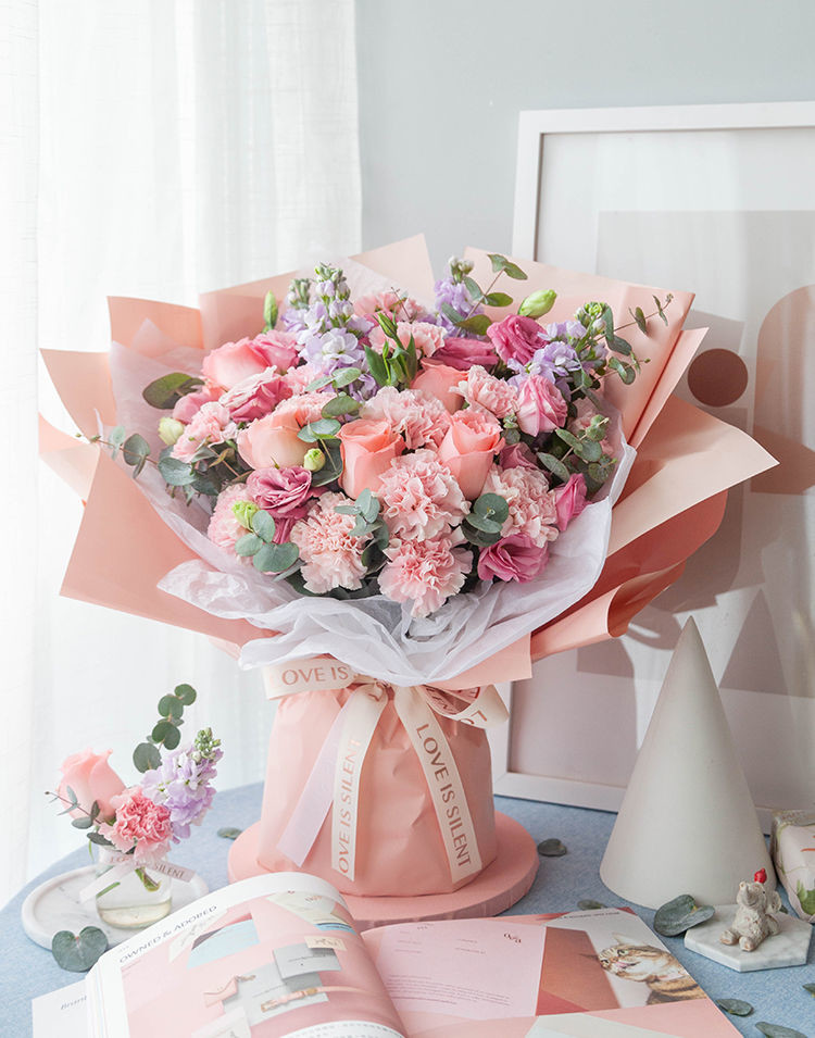 别小看康乃馨!我们用进口粉康+雾中情人打底,柔雾感扑面而来。有位女儿订给妈妈,老人发语音说:“这花看着就舒服,不扎眼,像闺女的手摸着我脸。”——给长辈的花,不是越艳越好,是“恰到好处的温柔”才动人心。