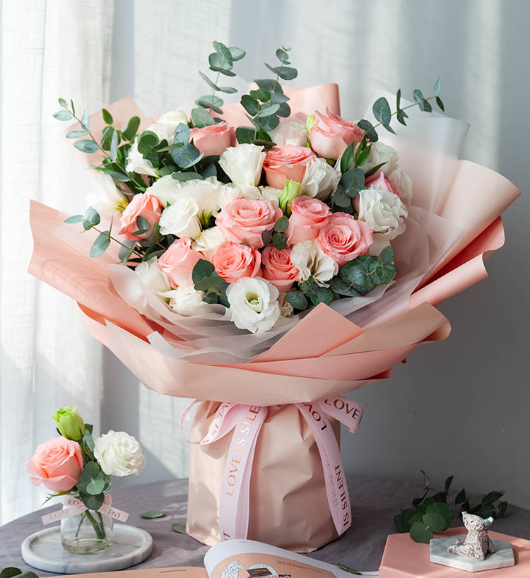 包装点睛:根据花束风格选择包装。简约风配牛皮纸、雾面纸;甜美风配粉色、白色礼盒或丝带。独特的“抱抱桶”或“花盒”形式,也深受欢迎。