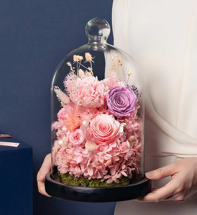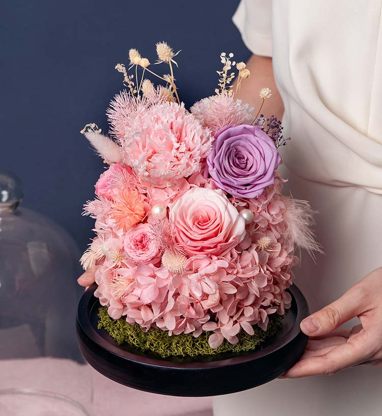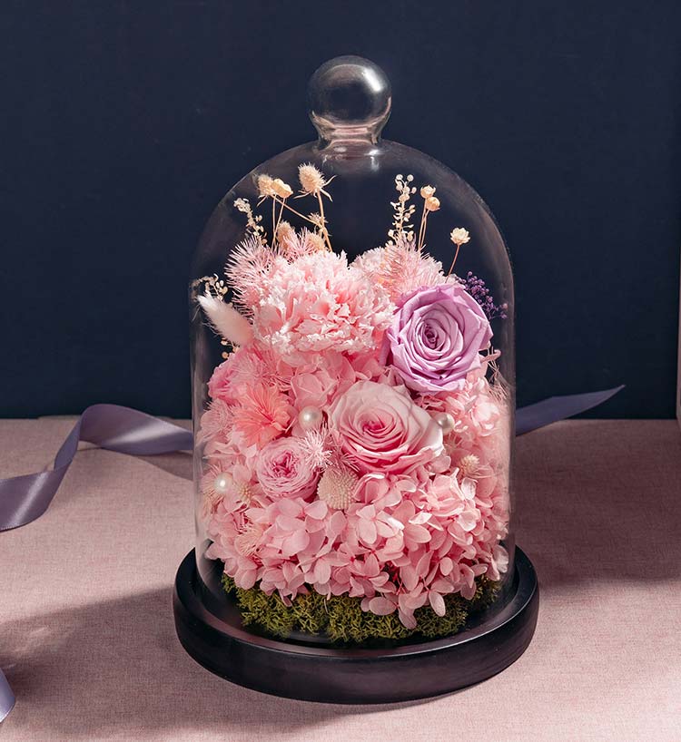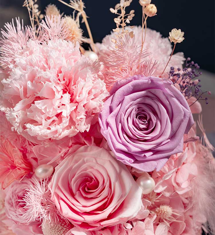 渐变粉白色玫瑰1朵,浅粉紫色玫瑰1朵,粉色康乃馨2朵