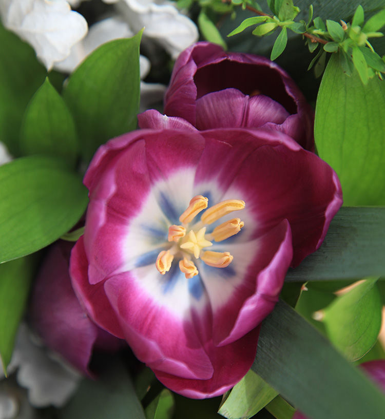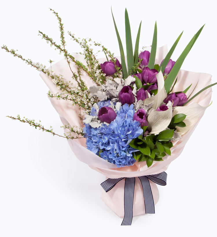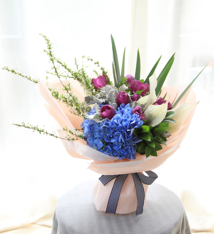 白掌3枝、紫色郁金香13枝、深蓝绣球1枝