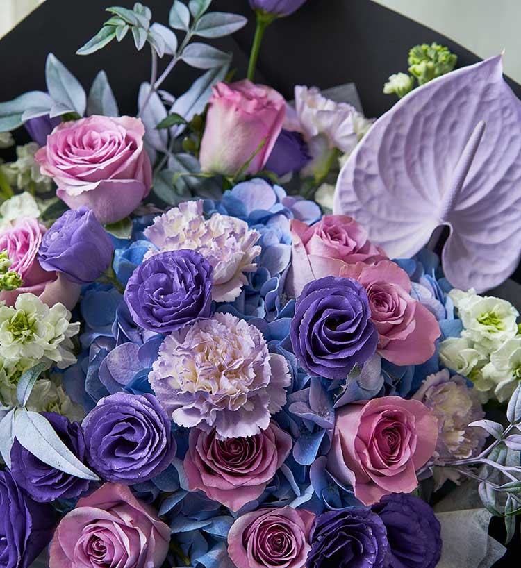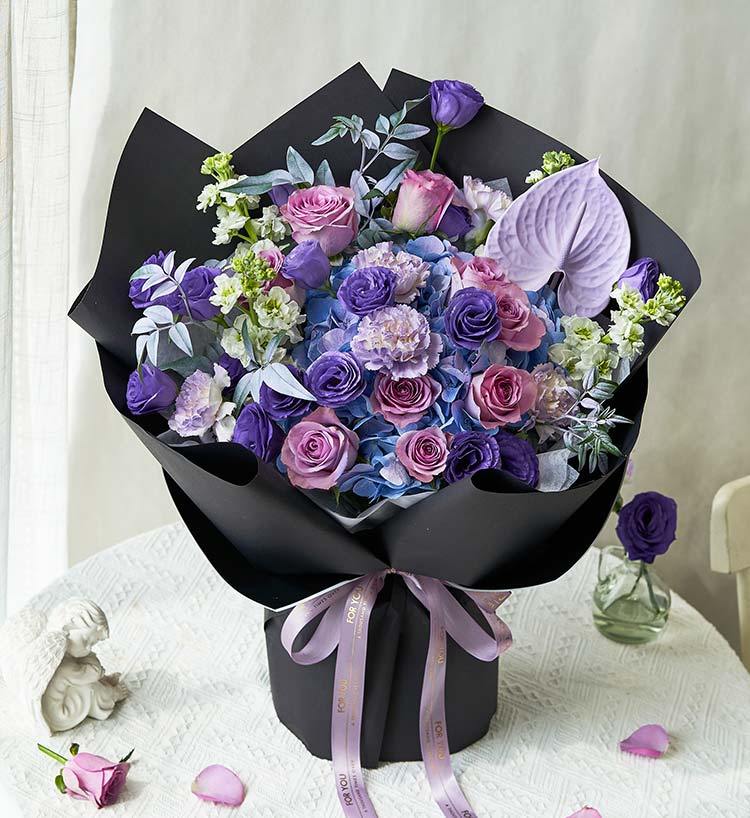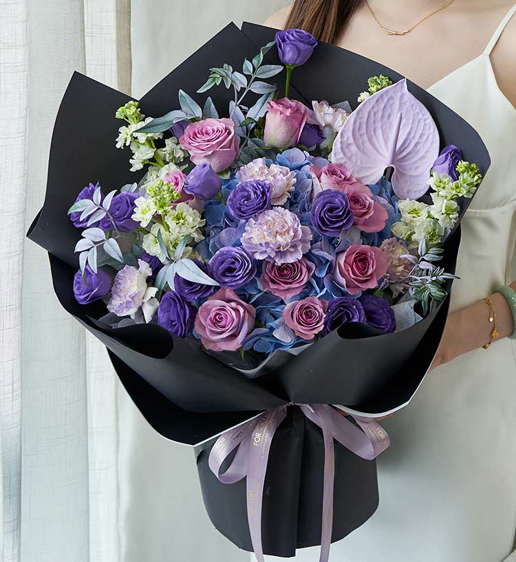 蓝色绣球1枝,紫色玫瑰9枝,深紫色桔梗6枝