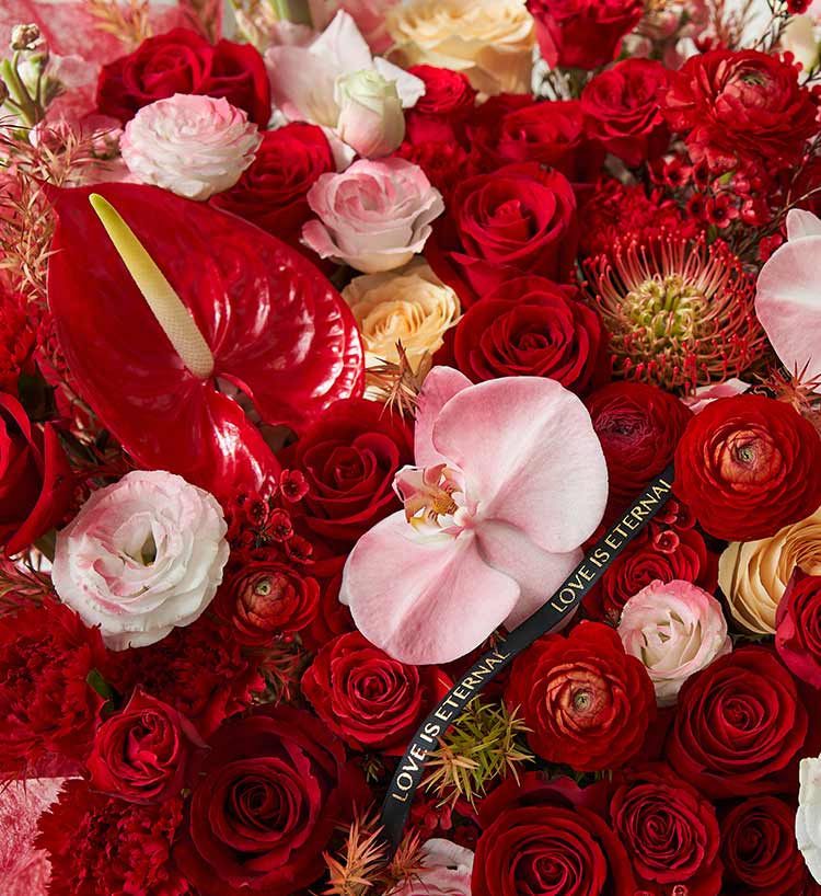 红玫瑰17枝,多头红玫瑰、香槟玫瑰、金红色针垫、红色腊梅、红掌、蝴蝶兰