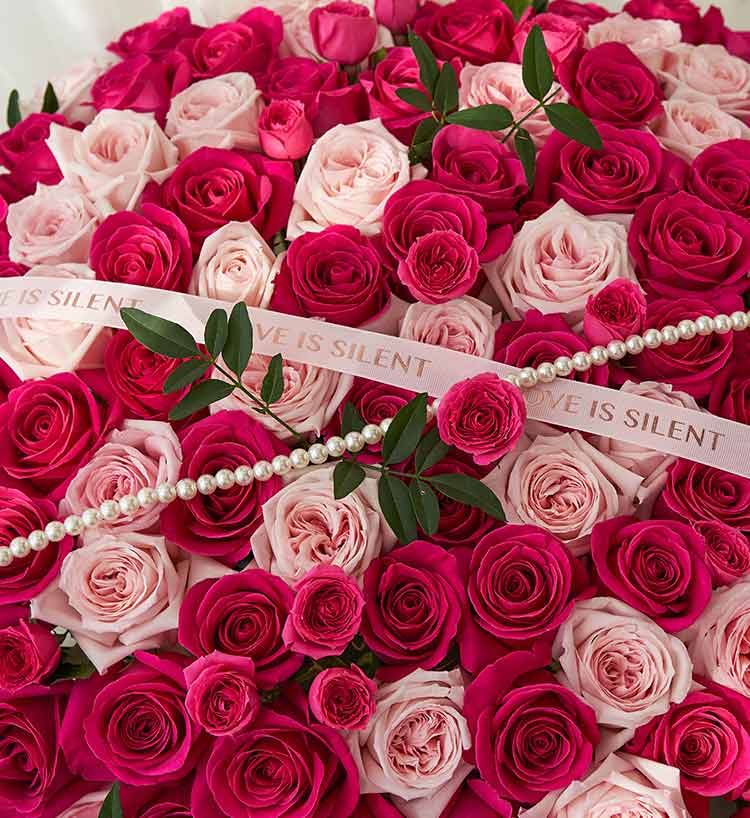 99枝玫瑰:弗洛伊德玫瑰59枝+粉色荔枝玫瑰40枝,搭配苏菲宝贝多头玫瑰4枝