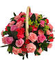 花材:桃红色玫瑰10枝,红康乃馨10枝,粉色康乃馨30枝,绿叶适量